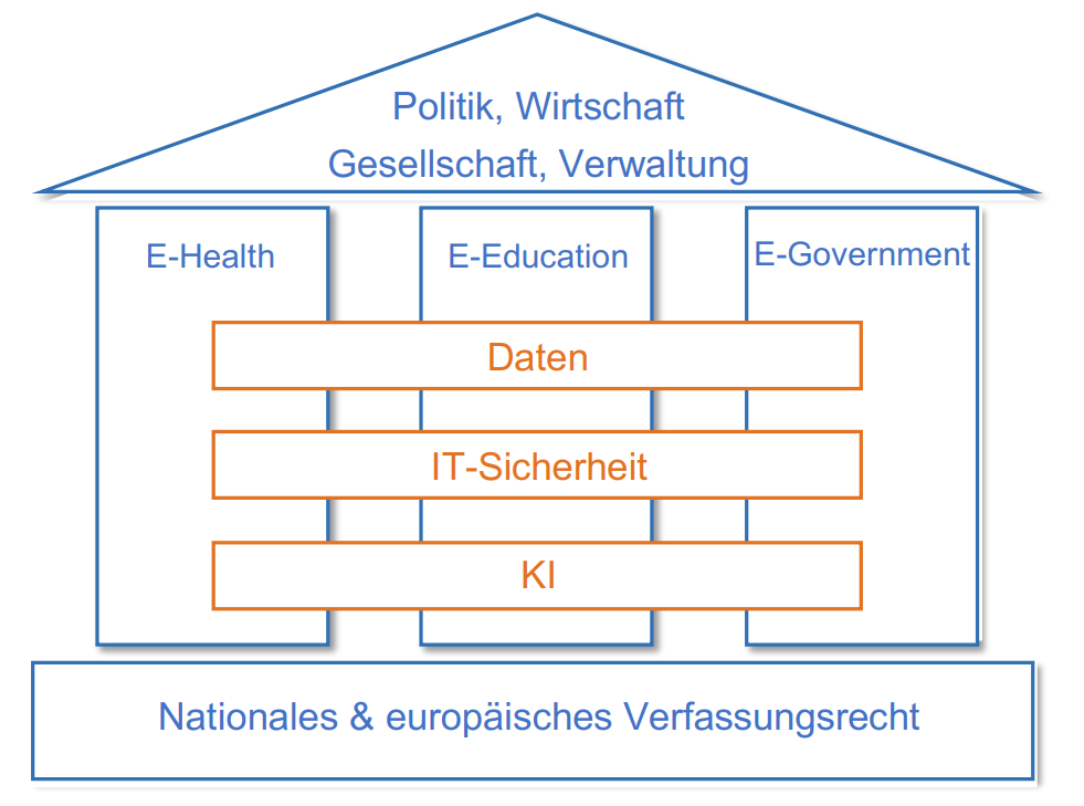 Die wissenschaftliche Betrachtung der drei Schwerpunktsäulen E-Government, E-Health und E-Education wird dabei maßgeblich durch die verfassungsrechtlichen und unionalen Vorgaben geprägt. Darüber hinaus ergeben sich Fragen in den Querschnittsmaterien Datenrecht, (IT-)Sicherheitsrecht und Einsatz sowie Regulation von Künstlicher Intelligenz, die projekt- und themenunabhängig bestehen und bearbeitet werden.